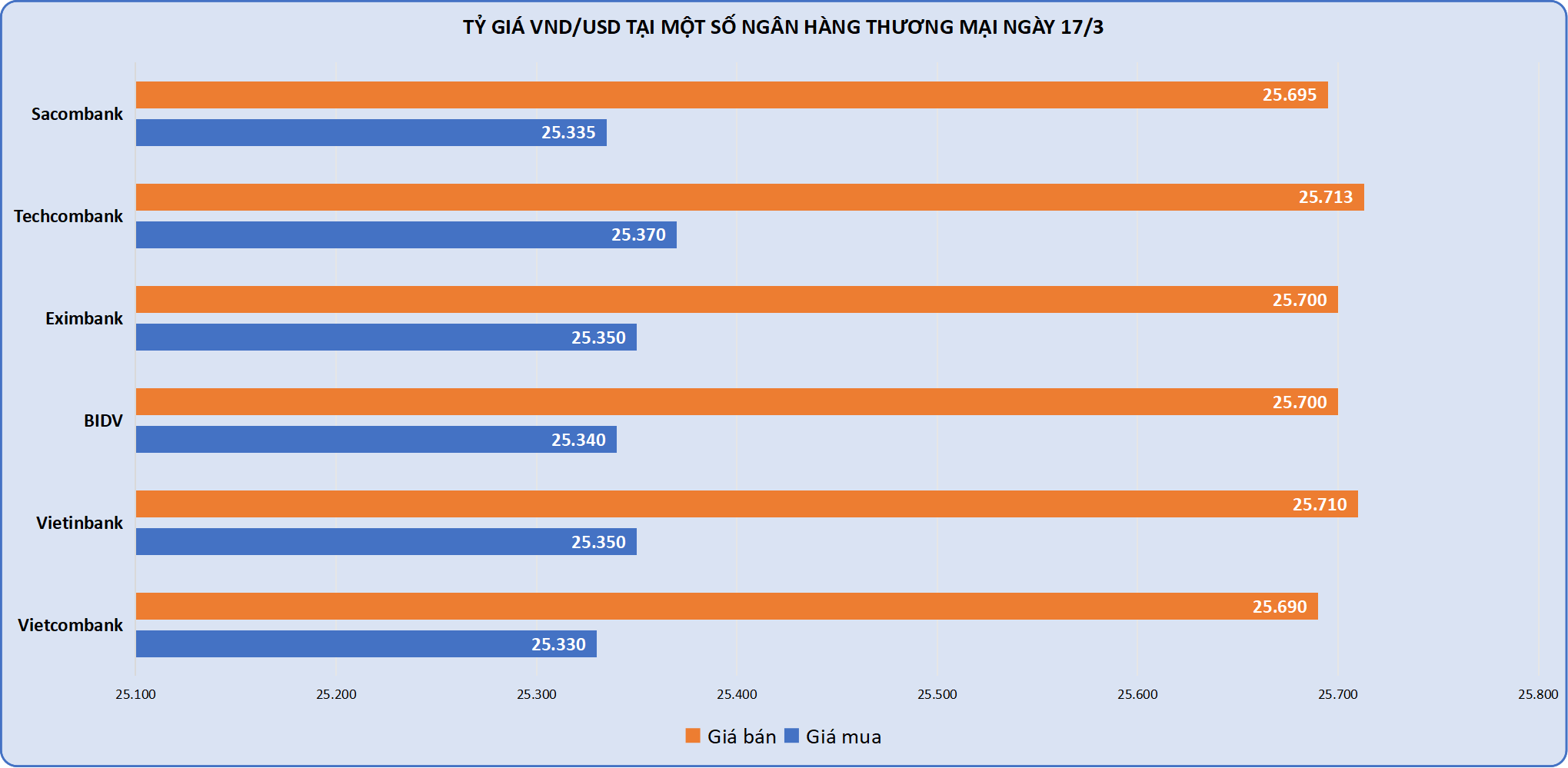 Ngân hàng Eximbank niêm yết USD ở mức 25.350 - 25.700 VND/USD, không đổi so với phiên trước đó. Trong khi Techcombank, giá USD điều chỉnh tăng 5 đồng ở mỗi chiều, đang niêm yết ở mức 25.370 - 25.713 VND/USD.