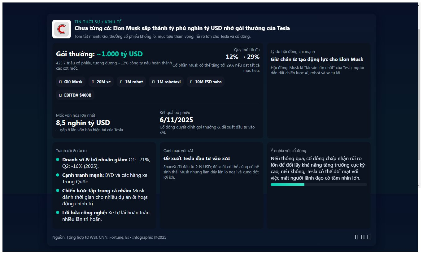 Elon Musk – người giàu nhất hành tinh – đang đứng trước cơ hội trở thành tỷ phú nghìn tỷ USD đầu tiên trong lịch sử, nhờ một gói thưởng cổ phiếu khổng lồ mà hội đồng quản trị Tesla vừa trình cổ đông. Tuy nhiên đằng sau con số gây choáng đó là một ván cược đầy rủi ro cho tương lai hãng xe điện này.