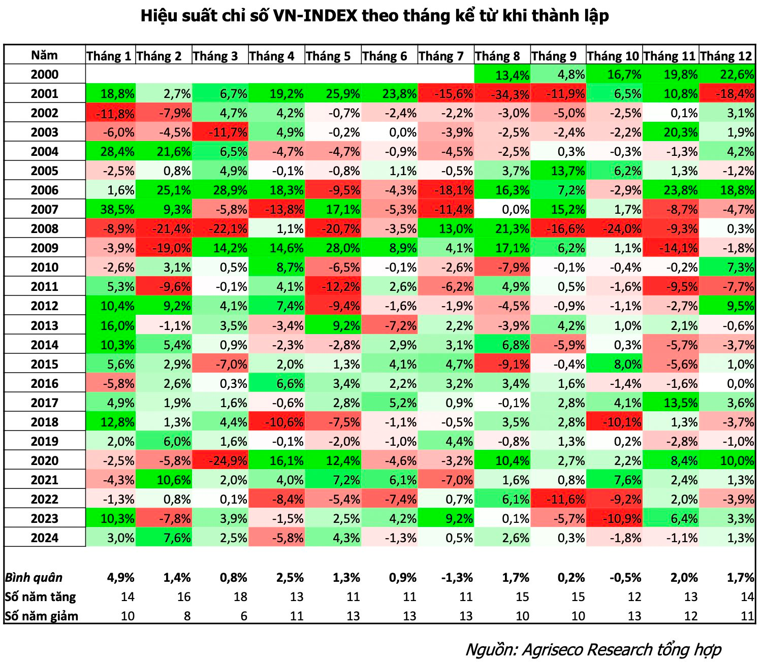 Tuy nhiên, Agirseco cho rằng thị trường chứng khoán có xác xuất tăng khá cao trong tháng 1. Thống kê nhanh về tháng 1 từ khi thị trường chứng khoán Việt Nam được thành lập vào tháng 8/2000 cho tới nay. Tháng 1 có 14/24 năm tăng điểm, tương ứng xác suất 58,3%, hiệu suất bình quân tháng đầu năm là +4,9%, cao nhất trong các tháng.