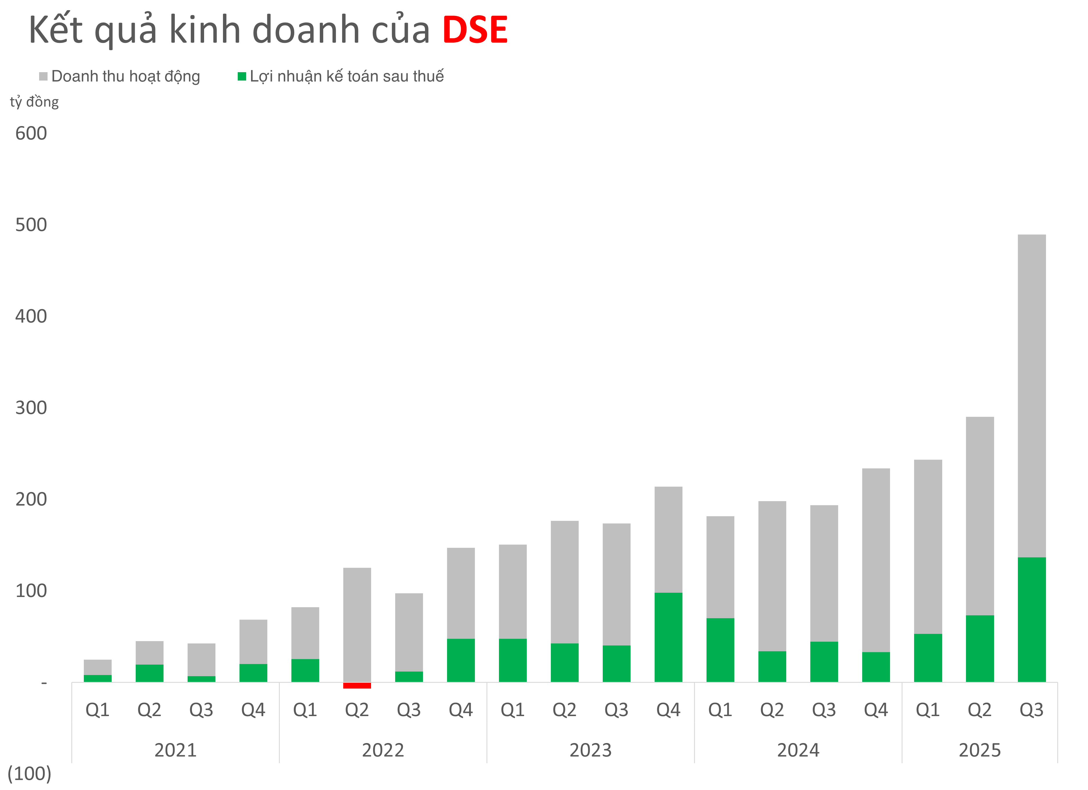 Trong 9 tháng năm 2025, doanh thu của DSE đạt 1.023 tỷ đồng và lãi sau thuế hơn 263 tỉ đồng, đều gần gấp đôi cùng kỳ và vượt kế hoạch lợi nhuận năm.
