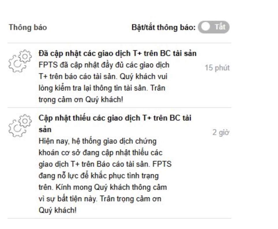 Cụ thể, thông báo từ FPTS cho biết hệ thống giao dịch chứng khoán cơ sở cập nhật thiếu các giao dịch T+ trên báo cáo tài sản. Tới đầu phiên giao dịch chiều 16/6, công ty đã thông báo khắc phục được lỗi và cập nhật đầy đủ các giao dịch T+ trên báo cáo tài sản của nhà đầu tư.