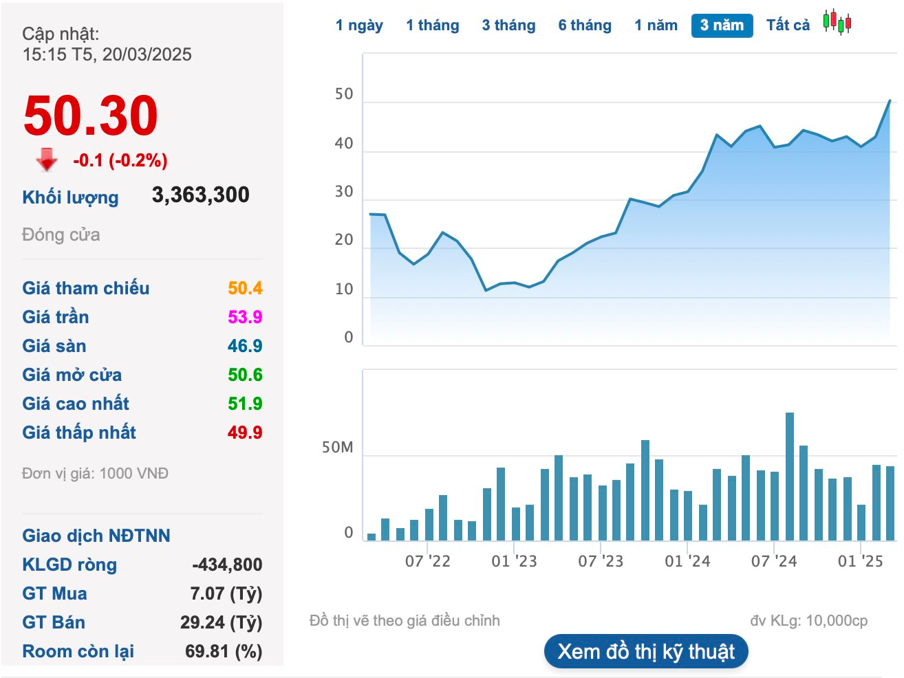 Trên sàn chứng khoán, cổ phiếu FTS của Chứng khoán FPT đang neo giá gần vùng đỉnh lịch sử. Đóng cửa phiên 20/3, thị giá FTS dừng ở mức 50.300 đồng/cp, tăng 19% so với đầu năm. Vốn hóa thị trường tương ứng vào khoảng 15.400 tỷ đồng.