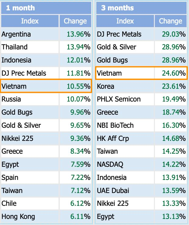 Tính từ đáy thuế quan xác nhận ngày 9/4, VN-Index đã tăng gần 550 điểm. Trong giai đoạn này, chứng khoán Việt Nam có nhiều phiên bứt phá ngoạn mục, nằm trong top đầu khu vực và thế giới. Thậm chí, nếu tính trong 3 tháng trở lại đây, không có chỉ số chứng khoán nào trên thế giới tăng mạnh hơn VN-Index.