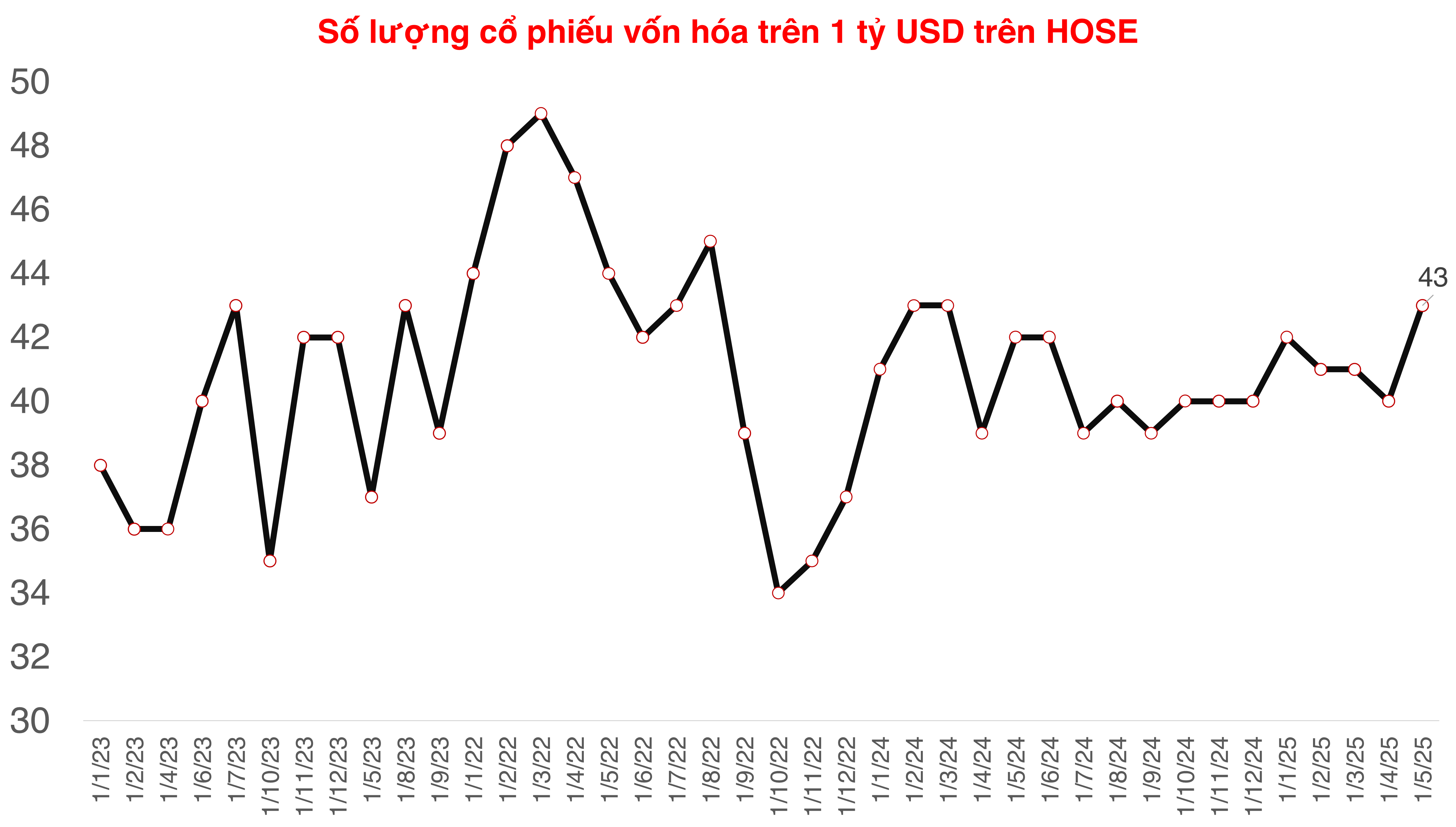Tính đến cuối tháng 5/2025, toàn thị trường ghi nhận 43 doanh nghiệp có vốn hóa trên 1 tỷ USD, trong đó có ba doanh nghiệp đạt vốn hóa vượt 10 tỷ USD gồm Ngân hàng TMCP Ngoại thương Việt Nam (VCB), Tập đoàn Vingroup (VIC) và Công ty cổ phần Vinhomes (VHM).