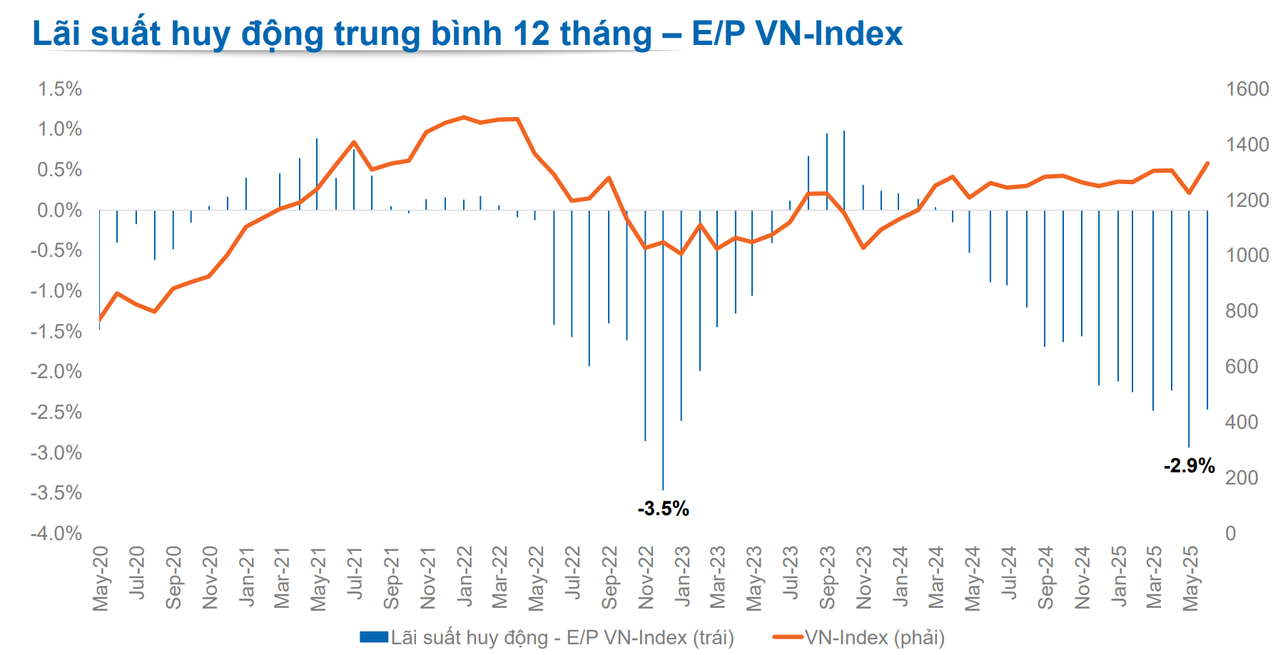 Về mặt định giá, hệ số P/E TTM của VN-Index hiện ở mức 13,1 lần, thấp hơn trung bình 10 năm (15,1 lần); chênh lệch E/P – lãi suất tiết kiệm đang ở mức -2,5%, tiệm cận vùng hấp dẫn như tháng 11/2022.