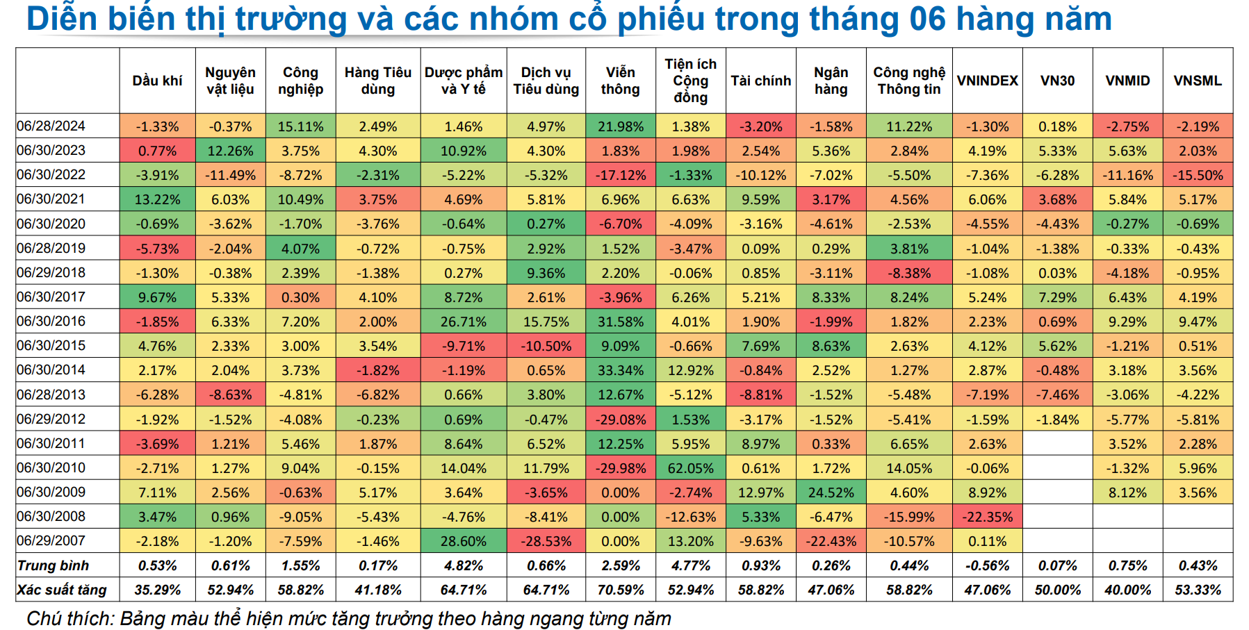 Cùng với đó, nhóm cổ phiếu Midcap và Smallcap có xác suất tăng cao trong tháng 6, đặc biệt là ở các nhóm ngành: Dược phẩm – Y tế, Dịch vụ tiêu dùng, Tiện ích công cộng, Ngân hàng và Tài chính.