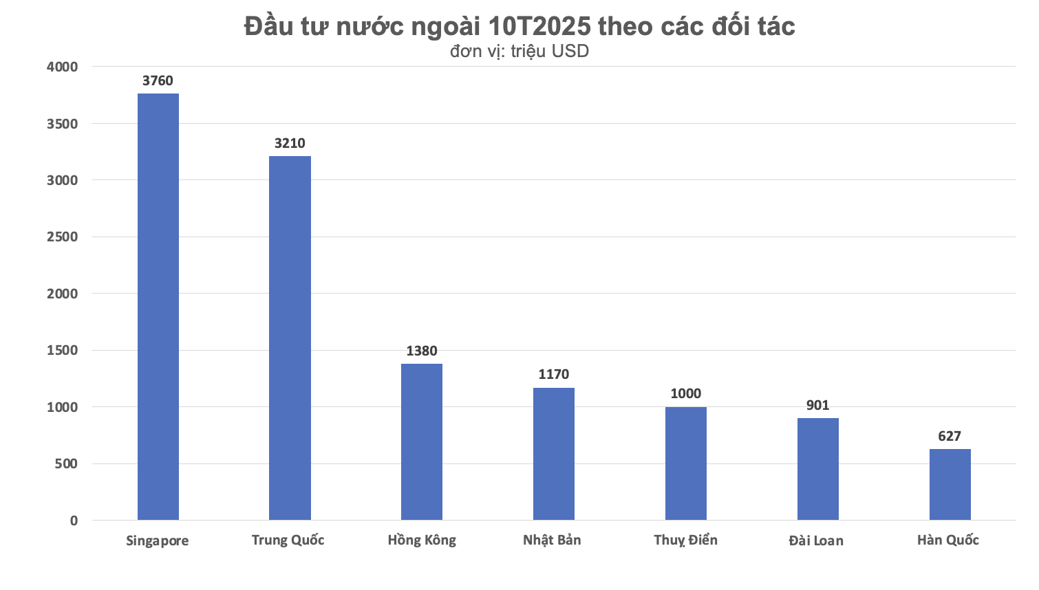 Trong số 87 quốc gia và vùng lãnh thổ có dự án đầu tư được đăng ký mới tại Việt Nam trong 10 tháng năm 2025, Singapore dẫn đầu, với 3,76 tỷ USD, chiếm 26,7% tổng vốn đăng ký cấp mới.