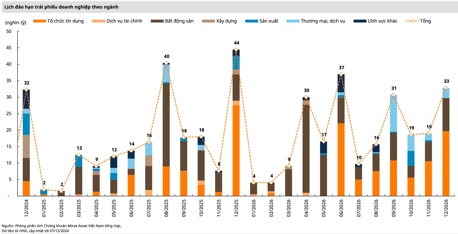 Theo báo cáo chiến lược tháng 12 của Mirae Asset, khoảng 50 trái phiếu dự kiến sẽ đáo hạn trong tháng cuối cùng của năm 2024, với tổng giá trị đáo hạn đạt khoảng 39.000 tỷ đồng. Trong đó, khoảng 8.500 tỷ đồng đến từ lĩnh vực sản xuất; 7.000 tỷ đồng từ các doanh nghiệp xây dựng; 7.000 tỷ đồng khác từ lĩnh vực bất động sản; và các ngân hàng thương mại chiếm gần 6.000 tỷ đồng.