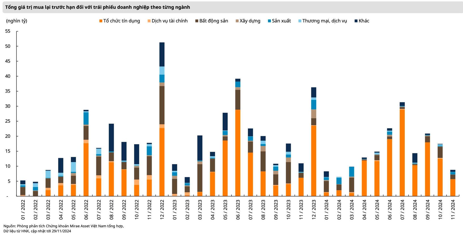 Luỹ kế từ đầu năm, tổng giá trị phát hành trái phiếu doanh nghiệp đã đạt 355.000 tỷ đồng (tăng 49,5% so với cùng kỳ). Trong khi đó, tổng giá trị mua lại sớm đạt 168.000 tỷ đồng, giảm 16% so với cùng kỳ. Động thái mua lại trước hạn đến từ các tổ chức tín dụng chiếm gần 73% tổng giá trị; các lĩnh vực bất động sản và sản xuất đứng sau, lần lượt đóng góp 13% và 5,4%.