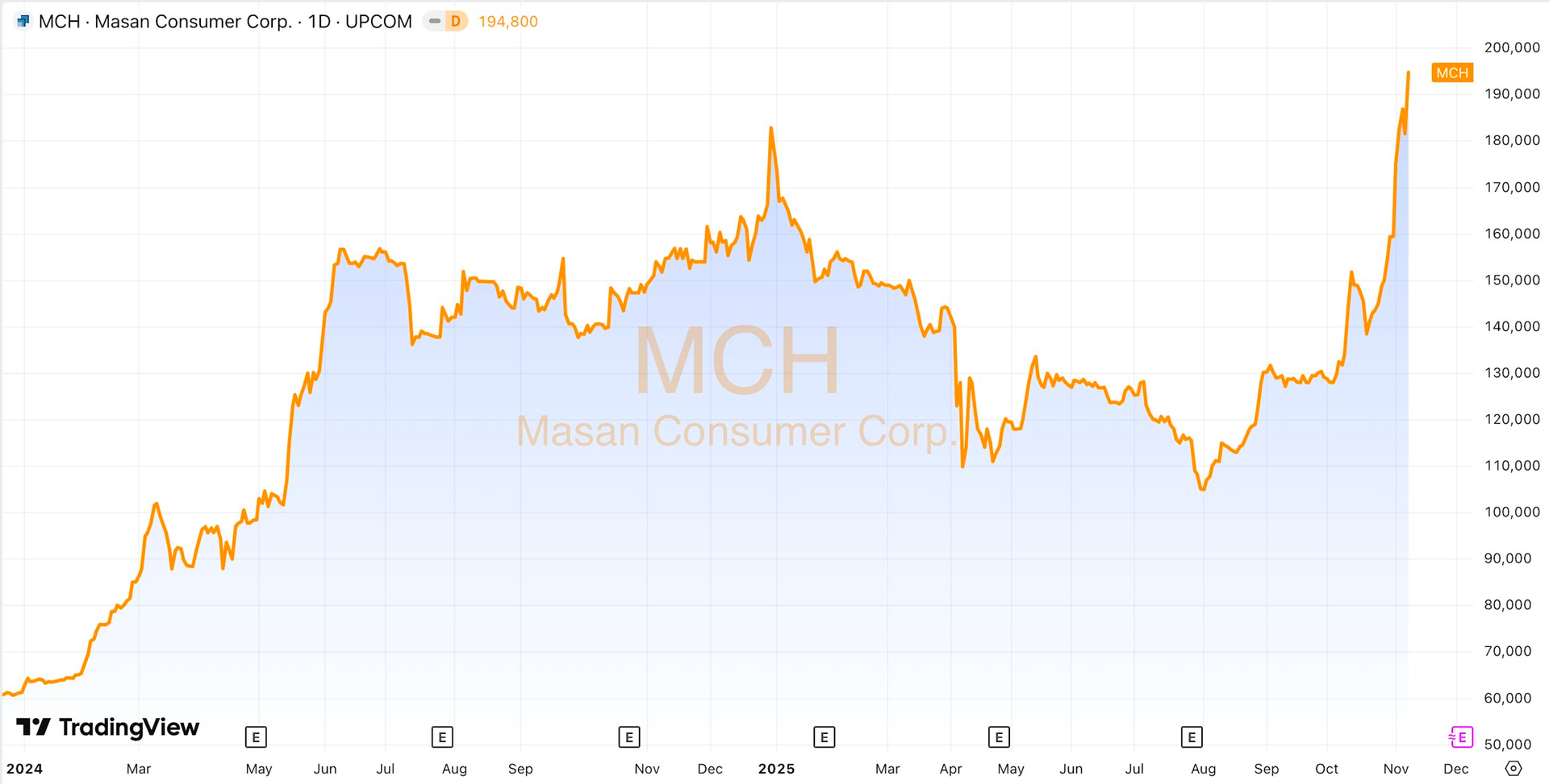 Cổ phiếu Masan Consumer (mã MCH) đang gây ấn tượng mạnh khi liên tục tăng mạnh, ngược dòng thị trường chung. Chỉ trong vòng 1 tháng trở lại đây, cổ phiếu này đã tăng 50% thị giá qua đó lập đỉnh mới 194.800 đồng/cp. Vốn hóa thị trường của Masan Consumer cũng theo đó vượt 200.000 tỷ đồng, lần đầu kể từ khi lên sàn chứng khoán.