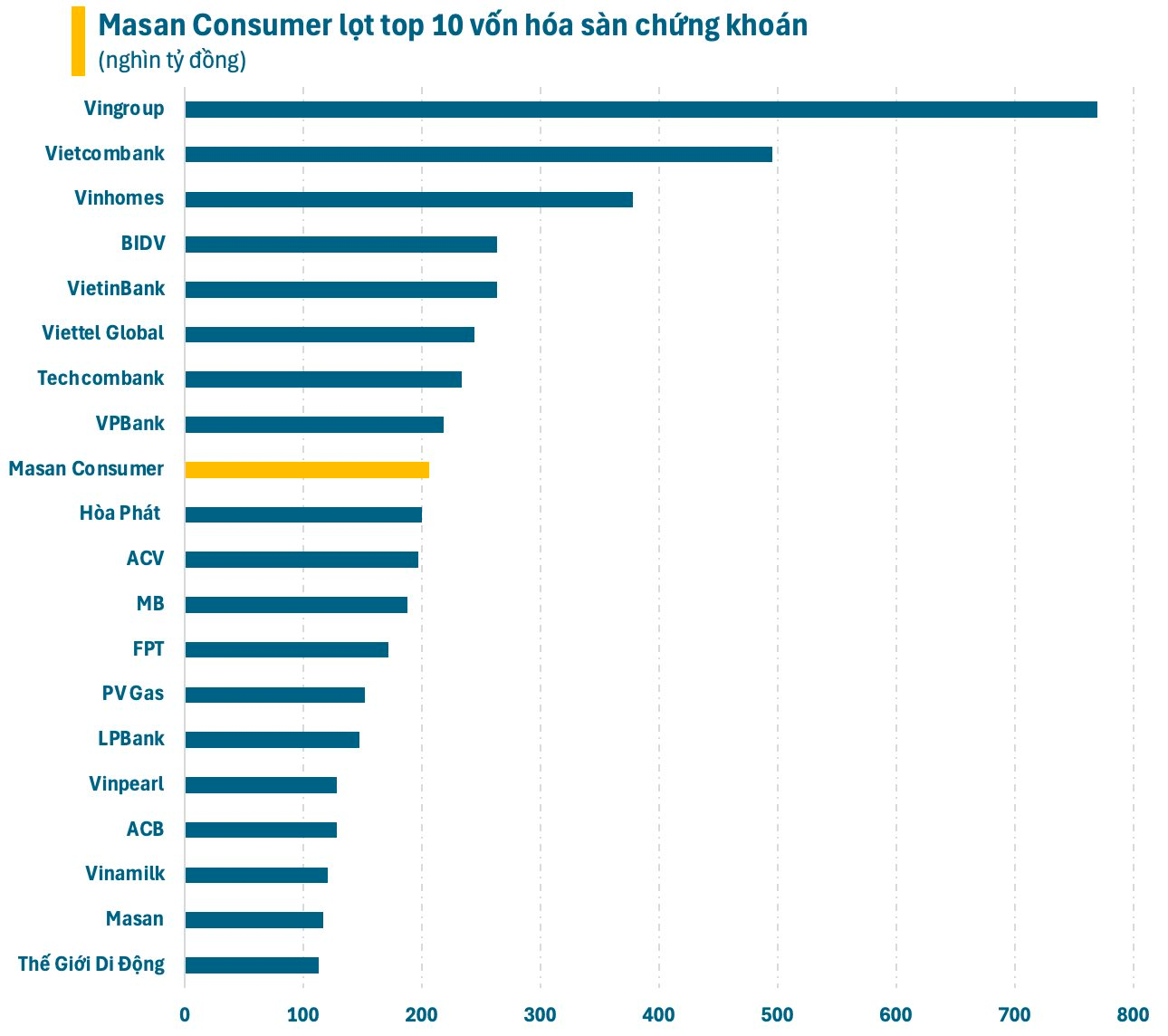 Đà bứt phá đưa Masan Consumer lọt top 10 doanh nghiệp có vốn hóa lớn nhất toàn thị trường, vượt qua nhiều tên tuổi đình đám như “anh cả” ngành thép Hòa Phát, “ông trùm” Cảng hàng không (ACV), tập đoàn công nghệ số 1 Việt Nam (FPT), “đại gia” ngành sữa Vinamilk và cả công ty mẹ là Masan. Vốn hóa Masan Consumer thậm chí còn lớn hơn nhiều ngân hàng như MB, LPBank hay ACB,…