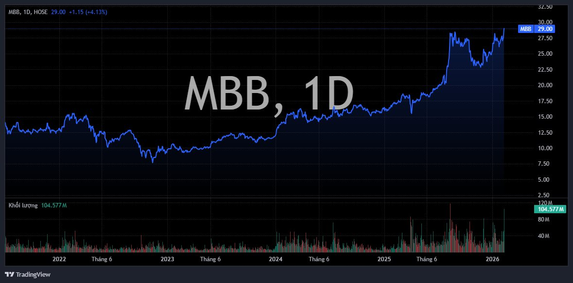 Chứng khoán SHS trong báo cáo mới đây đưa ra dự báo rằng MBB có thể đạt 39.988 tỷ đồng lợi nhuận trước thuế trong năm 2026, tăng 17% so với năm trước trên cơ sở tăng trưởng tín dụng tăng trưởng 35%, NIM giảm nhẹ xuống 3,8%, tỷ lệ nợ xấu tăng lên 1,5%.