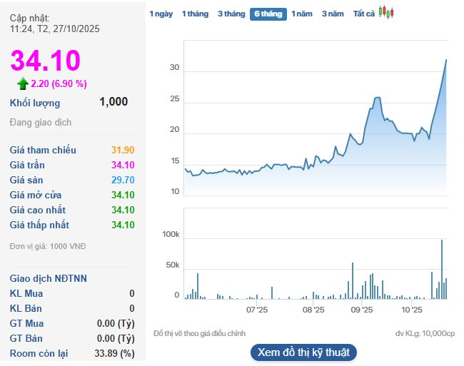 Tính từ đầu tháng 10 tới nay, cổ phiếu này bứt phá hơn 70% giá trị, tiến lên đỉnh gần 3 năm (kể từ tháng 2/2023). Vốn hóa thị trường tăng mạnh đạt gần 3.200 tỷ đồng.