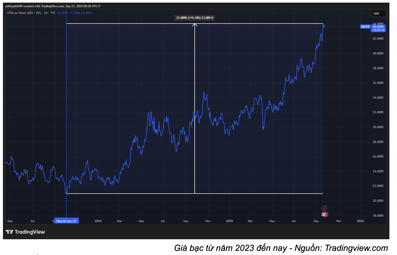 Trong 2 năm vừa qua, bạc đã âm thầm tăng giá hơn 100%, vượt xa nhiều kênh đầu tư khác. Đầu tháng 10/2023, giá bạc quốc tế giao dịch quanh mức 21 USD/ounce. Gần 2 năm sau, vào ngày 22/9/2025, giá bạc đã chạm mốc 44 USD/ounce – mức cao nhất trong hơn 14 năm. Sự trỗi dậy này của bạc bắt nguồn từ những rạn nứt trong hệ thống tài chính toàn cầu. Với khoản nợ công lên tới 35 nghìn tỷ USD, chính quyền Tổng thống Mỹ Donald Trump đang thúc giục Cục Dự trữ Liên bang Mỹ (Fed) cắt giảm lãi suất để hỗ trợ cho khoản nợ khổng lồ này. Điều này dấy lên những lo ngại về lạm phát và giá trị đồng đô la suy yếu.