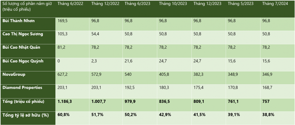 Như vậy tính đến ngày 18/7, tổng lượng cổ phiếu NVL mà nhóm cổ đông liên quan đến Chủ tịch Bùi Thành Nhơn nắm giữ còn khoảng 757 triệu cổ phiếu, tương đương 38,8% vốn điều lệ của tập đoàn này. Trong hơn 2 năm qua, tổng lượng cổ phiếu mà nhóm cổ đông liên quan ông Bùi Thành Nhơn chủ động bán ra và bị bán giải chấp là hơn 429 triệu cổ phiếu, tương ứng với 22% cổ phần tại Novaland.