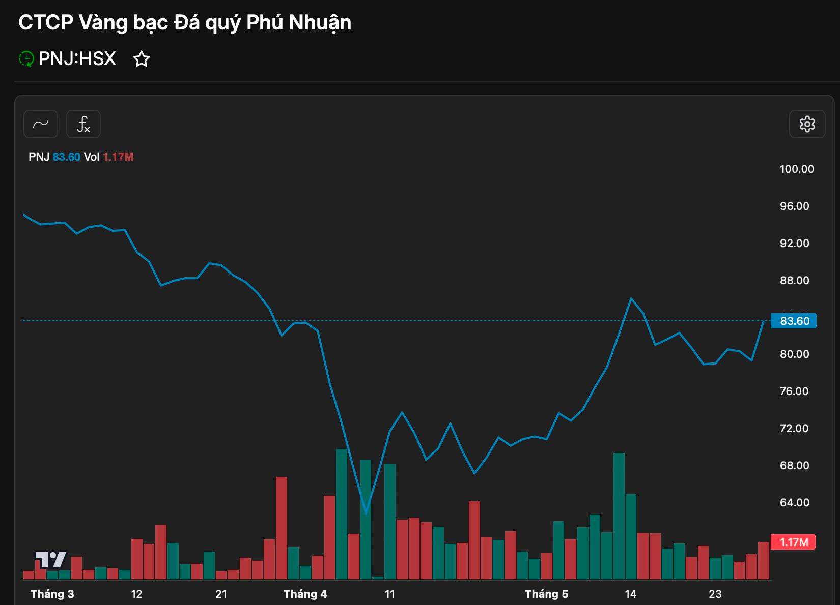 Sau đó, đà tăng dù có hạ nhiệt đôi chút nhưng PNJ vẫn duy trì mức tăng khoảng 5%. So với đáy dài hạn xác nhận hồi đầu tháng 4, PNJ đã tăng 33% thị giá. Vốn hóa thị trường tương ứng hơn 28.000 tỷ đồng.
