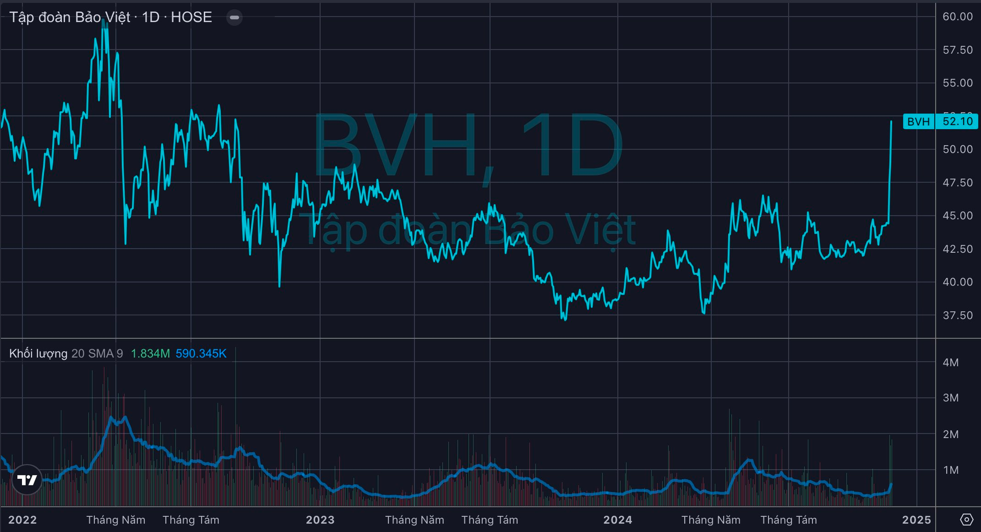 Thị trường chứng khoán những phiên gần đầy chứng kiến cú bứt phá mạnh mẽ và có phần bất ngờ của cổ phiếu Tập đoàn Bảo Việt (mã BVH). Chỉ sau 3 phiên, cổ phiếu này đã tăng hơn 17% qua đó leo lên mức 52.100 đồng/cp, cao nhất trong vòng hơn 2 năm trở lại đây. Vốn hóa thị trường cũng theo đó đạt xấp xỉ 39.000 tỷ đồng, tăng 35% so với hồi đầu năm 2024.
