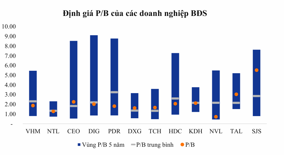 Sau nhịp điều chỉnh mạnh từ đỉnh, mặt bằng định giá của cổ phiếu bất động sản đã trở về vùng P/B trung bình 5 năm. Điều này cho thấy rủi ro đã phần nào được chiết khấu vào giá, đồng thời tạo dư địa cho kỳ vọng tăng trưởng mới khi chu kỳ phục hồi của nhóm ngành bắt đầu hình thành. Chỉ một số ít cổ phiếu đang giao dịch trên mức định giá trung bình như TAL hay SJS.