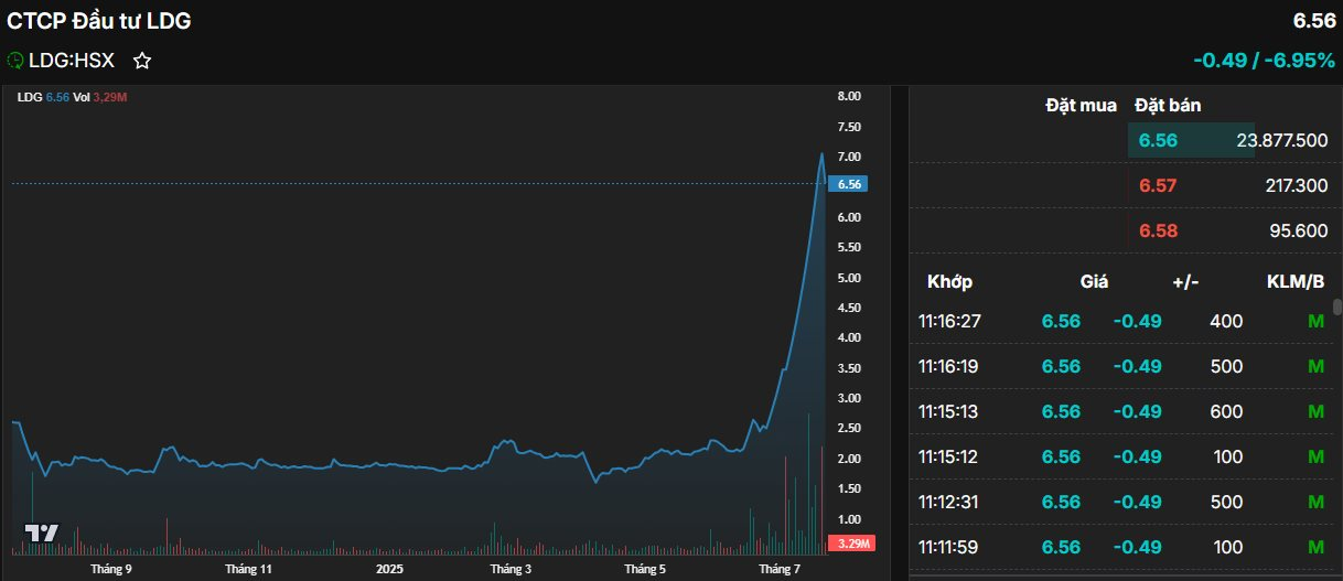 Nhịp chỉnh mạnh diễn ra sau quãng “phi như tên lửa” của LDG với 18 phiên kịch trần trong vòng hơn 1 tháng trở lại đây. Thị giá từ vùng 2.xxx đồng/cp vọt mạnh lên 7.050 đồng/cp (chốt phiên 18/7), tương ứng mức tăng gần 180%. Hiện tại, LDG vẫn đang trong diện cảnh và kiểm soát kể từ ngày 11/4 do kinh doanh thua lỗ. Tính đến 31/3/2025, LDG đang ghi nhận lỗ lũy kế hơn 1.375 tỷ đồng, bằng 53% vốn điều lệ.