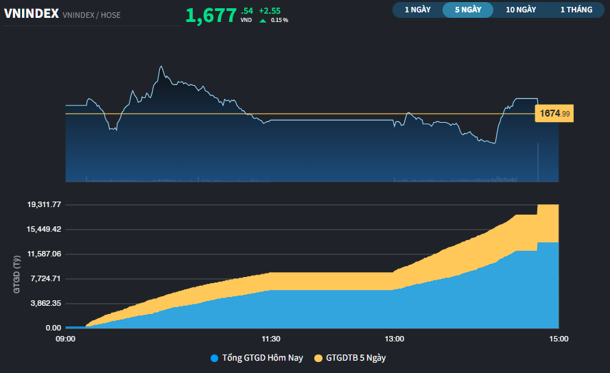 Chốt phiên, chỉ số VN-Index tăng 2,55 điểm lên 1.677,54 điểm. Tổng giao dịch đạt 14.980 tỷ đồng, tương đương 608,74 triệu đơn vị.