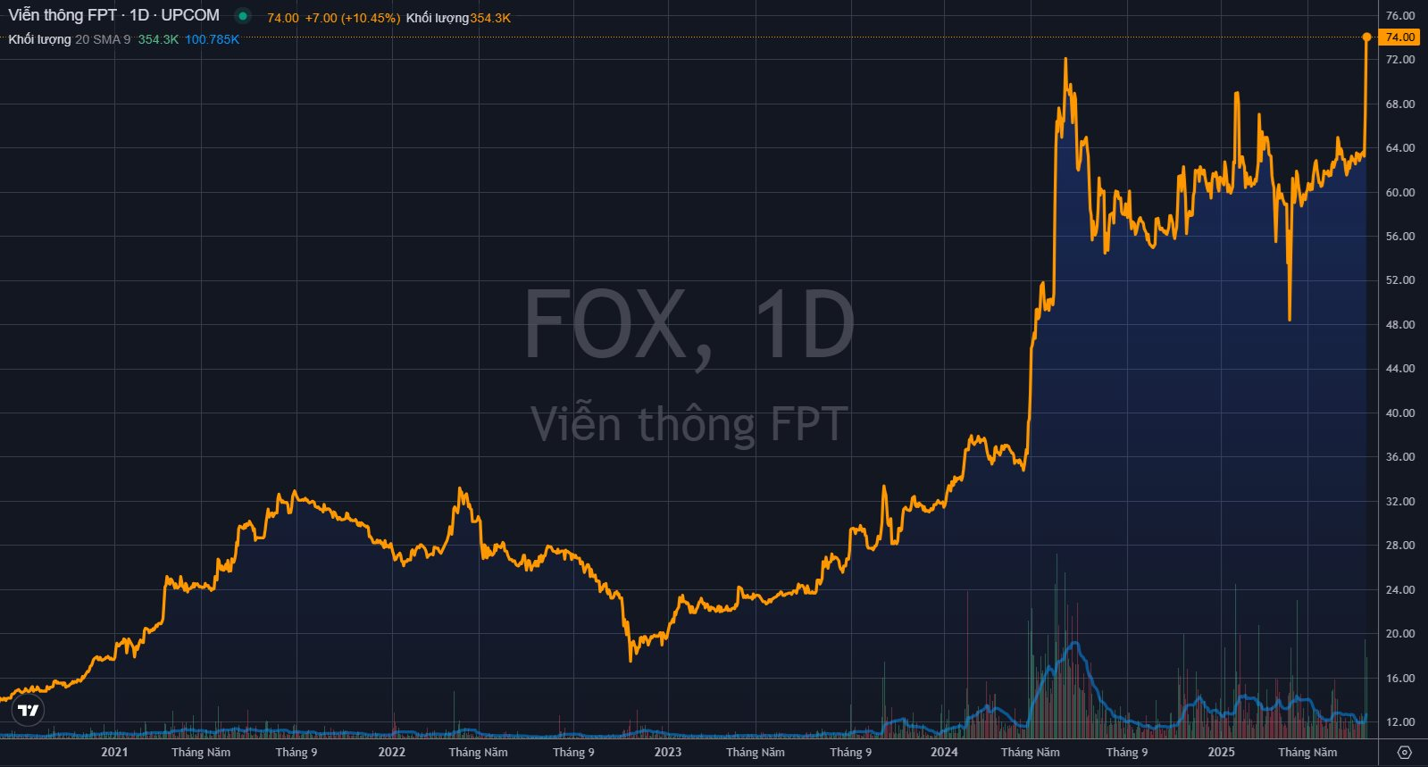 Thị trường chứng khoán phiên 17/7 chứng kiến sự bứt phá của cổ phiếu FOX - Công ty Cổ phần Viễn thông FPT (FPT Telecom). Thị giá FOX tăng 12% lên mốc 74.000 đồng/cp tại thời điểm cuối phiên sáng, vượt qua vùng đỉnh hồi tháng 6/2024 và thiết lập mức giá cao nhất trong lịch sử.