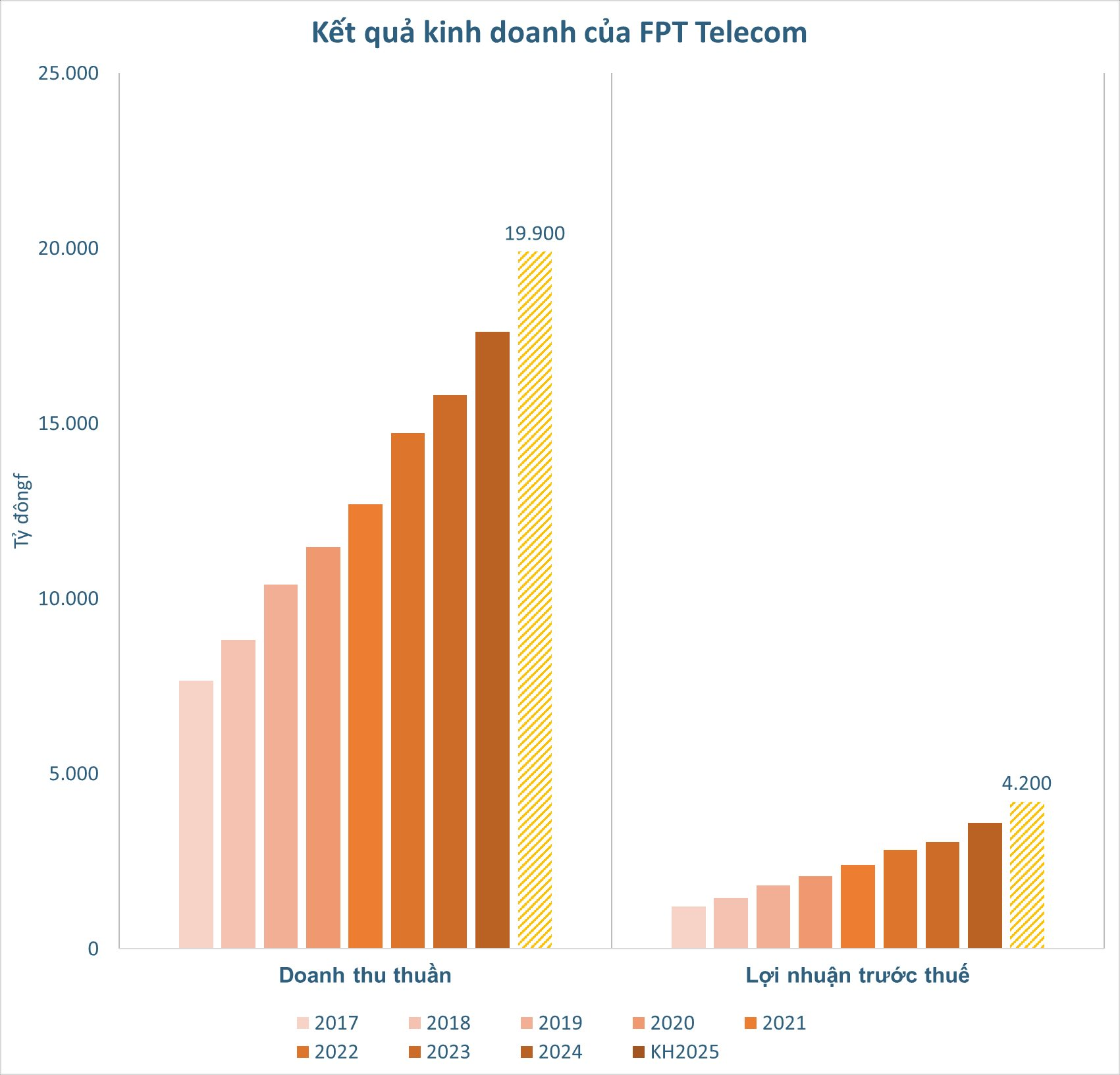 Sang năm 2025, FPT Telecom đặt mục tiêu doanh thu 19.900 tỷ đồng, tăng 13% so với năm 2024, trong đó doanh thu mảng viễn thông dự kiến 19.100 tỷ đồng, phần còn lại đến từ doanh thu nội dung số. Lãi trước thuế mục tiêu đạt 4.200 tỷ đồng, tăng 17%, nếu hoàn thành sẽ thiết lập mức kỷ lục mới về doanh thu và lợi nhuận.