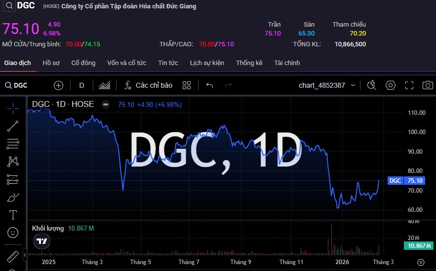 Đóng cửa phiên 24/2, cổ phiếu DGC của Hóa chất Đức Giang nhuộm “sắc tím”, thị giá tăng vọt lên mốc 75.100 đồng/cp, cao nhất kể từ giữa tháng 12 năm ngoái. Vốn hóa thị trường theo đó vượt trên ngưỡng 28.500 tỷ đồng.