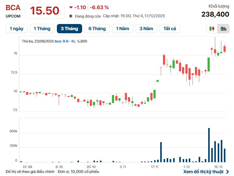 Động thái thoái vốn của lãnh đạo diễn ra trong bối cảnh giá cổ phiếu BCA đã bật tăng mạnh kể từ vùng đáy 8.200 đồng/cp thiết lập giữa tháng 10. Đóng cửa phiên 17/12, thị giá đạt 15.500 đồng/cp, tương ứng mức tăng khoảng 90% chỉ sau khoảng hai tháng.