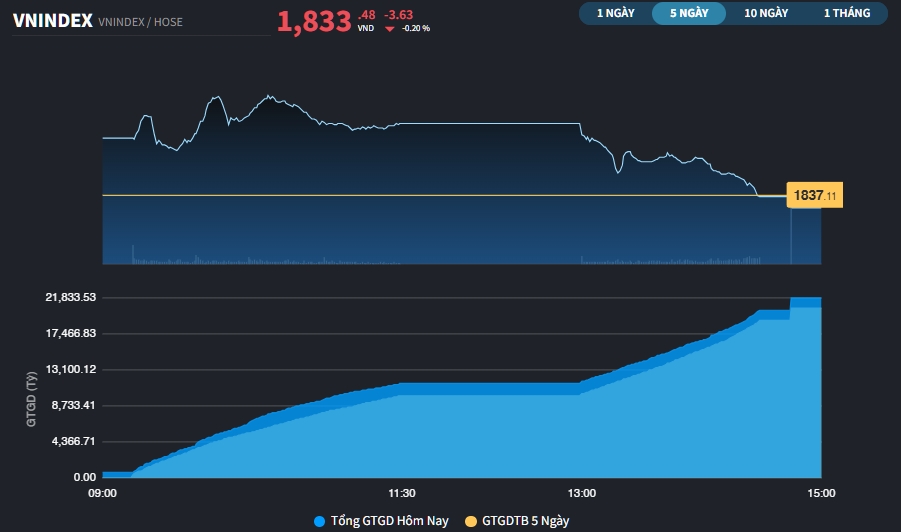 Chốt phiên, chỉ số VN-Index giảm 3,63 điểm xuống 1.833,48 điểm (-0,2%). Tổng giá trị giao dịch sàn đạt 24.615 tỷ đồng.
