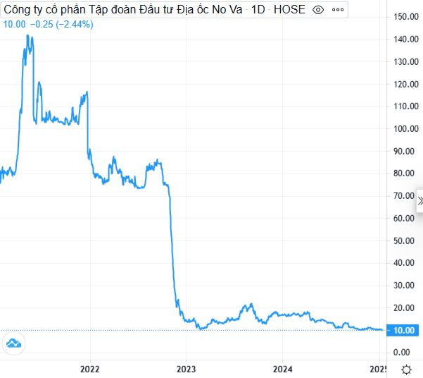 Cổ phiếu NVL đã giảm 41% trong một năm trở lại đây. Nếu so với đỉnh trên 92.000 đồng/cp từng lập vào giữa năm 2021, thị giá NVL đã giảm 93%. Vốn chỉ còn 19.989 tỷ đồng.