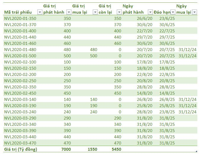 Trước đó, Novaland đã công bố phương án mua lại trái phiếu trước hạn với giá trị tối đa tính theo mệnh giá là 7.000 tỷ đồng. Danh sách dự kiến mua lại gồm 21 lô trái phiếu. Như vậy, sau khi mua 5 lô nói trên, doanh nghiệp này vẫn còn 5.450 tỷ đồng trái phiếu cần mua.