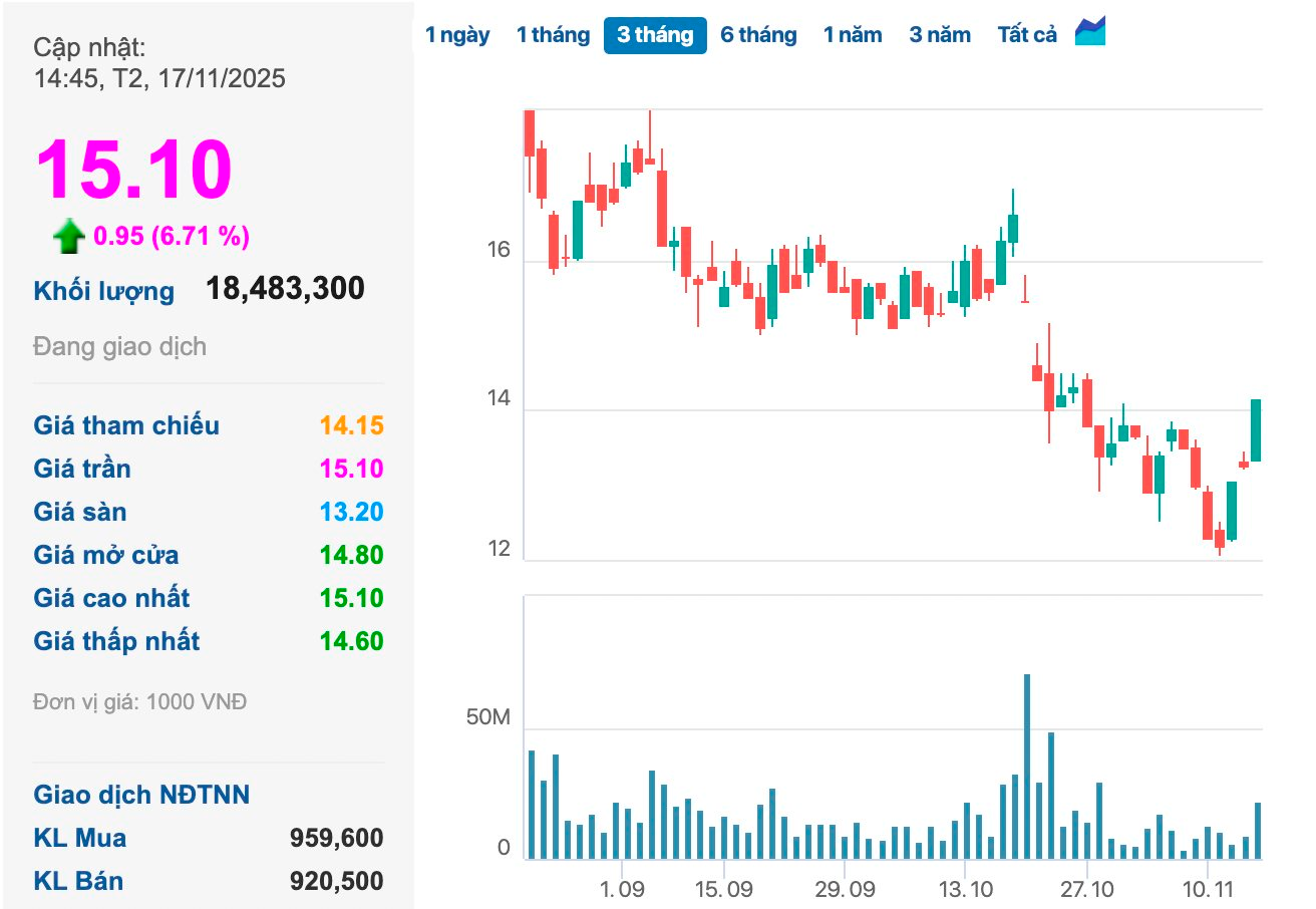 Kết phiên 17/11, giá cổ phiếu NVL ở mức 15.100 đồng/cổ phiếu, tăng trần 6,71% so với phiên trước, khối lượng cổ phiếu giao dịch khớp lệnh đạt gần 18,5 triệu đơn vị.