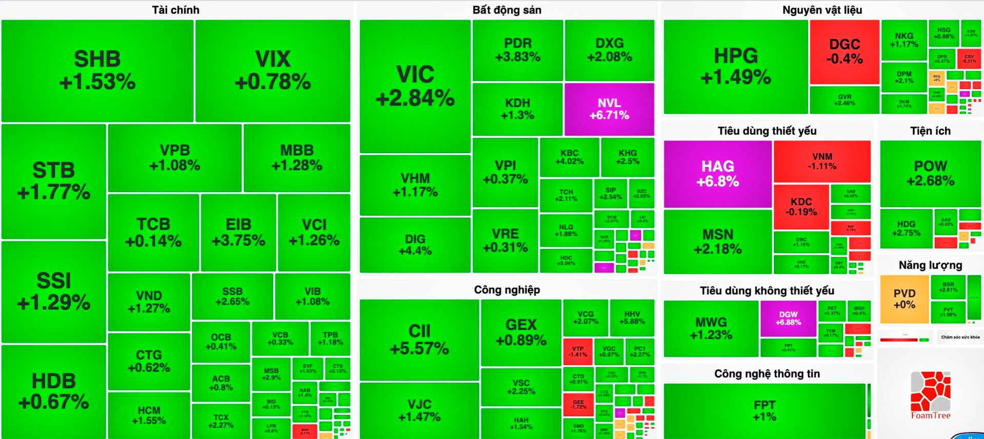Ngoài ra, loạt cổ phiếu vốn hoá lớn tăng bứt phá, đóng góp tích cực vào đà “thăng hoa” của thị trường, như: CII +5,57%, HAG +6,8%, DGW +6,88%, MWG +1,23%, BSR +2,81%, POW +2,68%, GVR +2,46%, DPM +2,1%, HPG +1,49%, …