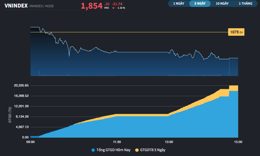VN-Index vẫn giữ được mốc trên 1.850 điểm dù đã có thời điểm bị kéo xuống 1.838 điểm. Chốt phiên, VN-Index chỉ giảm 21,74 điểm xuống 1.854,1 điểm (-1,16%). Tổng giá trị giao dịch sàn đạt 20.836 tỷ đồng, tương đương 714,56 triệu đơn vị.