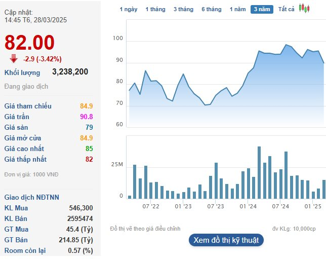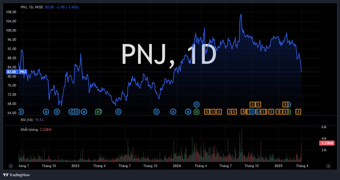 Kết thúc phiên 28/3, thị giá PNJ sụt giảm mạnh về mức 82.000 đồng/cp (-3,4% so với phiên trước), đánh dấu phiên giảm điểm thứ 6 liên tiếp. Đáng nói, đây đã vùng thấp nhất trong vòng hơn 1 năm trở lại đây (kể từ 5/1/2024). So với đỉnh lịch sử hồi tháng 8/2024, cổ phiếu PNJ mất hơn 23% giá trị, vốn hóa thị trường tương ứng "bốc hơi" 8.447 tỷ còn lại 27.700 tỷ đồng.
