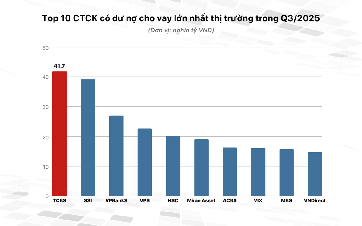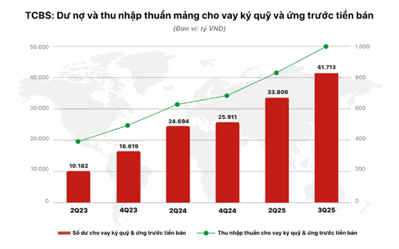 Theo thống kê, dư nợ cho vay (bao gồm margin và ứng trước tiền bán) tại các công ty chứng khoán tính đến cuối quý III/2025 đạt khoảng 383.000 tỷ đồng (~14,5 tỷ USD), tăng hơn 80.000 tỷ so với quý II và là mức cao nhất trong lịch sử. Trong đó, dư nợ margin ước tính đạt 370.000 tỷ đồng, tăng 27% chỉ trong một quý, góp phần thúc đẩy đà tăng hơn 280 điểm của VN-Index.