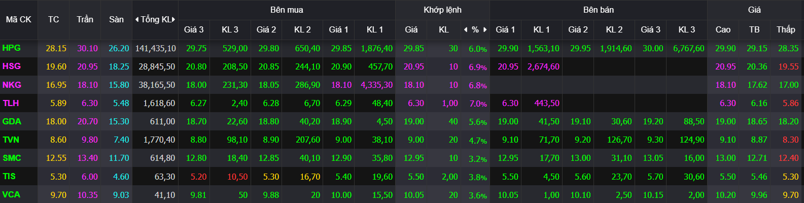 Trong phiên, cổ phiếu HPG dẫn đầu thanh khoản trên toàn thị trường với tổng giá trị khớp lệnh hơn 141,4 triệu đơn vị, tương đương hơn 4.123 tỷ đồng.