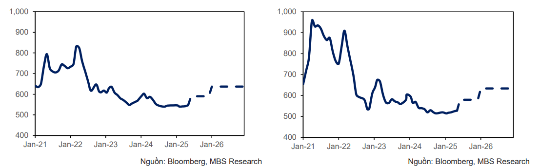Dự báo giá thép xây dựng (hình trái) và giá thép HRC (hình phải) năm 2025 – 2026. (Đơn vị: USD/tấn).