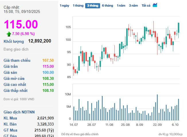 Cụ thể, kết phiên 9/10, giá cổ phiếu VHM tăng 6,98%, lên 115.000 đồng/cổ phiếu, khối lượng cổ phiếu giao dịch khớp lệnh đạt gần 12,9 triệu đơn vị.