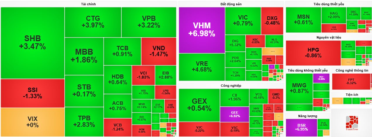 Xét theo nhóm ngành, cổ phiếu ngân hàng tiếp tục hút mạnh dòng tiền từ nhà đầu tư, tăng bứt phá, với: CTG +3,97%, SHB +3,47%, VPB +3,22%, TPB +2,83%, EIB +2,88%, MBBB +1,86%, …