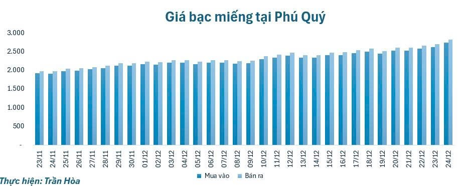 Giá bạc liên tiếp lập đỉnh kỷ lục, sáng 24/12, tại Phú Quý, giá bạc miếng niêm yết ở mức 2.735.000 – 2.820.000 đồng/lượng, tăng 122.000 đồng ở chiều mua và tăng 126.000 đồng ở chiều bán so với giá khảo sát sáng qua.