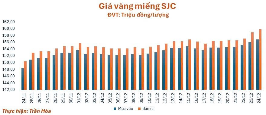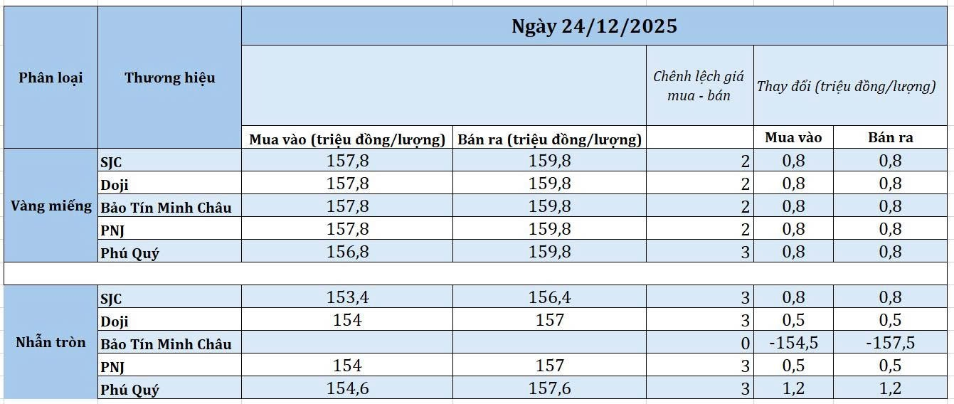 Phiên giao dịch sáng 24/12, giá vàng miếng SJC, Bảo Tín Minh Châu, Doji và PNJ đồng loạt tăng 0,8 triệu đồng/lượng ở cả chiều mua và chiều bán so với giá khảo sát sáng qua, đạt mức 157,8 – 159,8 triệu đồng/lượng (mua – bán), chênh lệch hai chiều ở ngưỡng 2 triệu đồng/lượng.