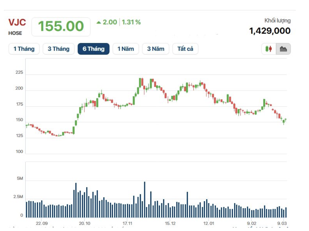 Chốt phiên giao dịch ngày 10/03/2026, cổ phiếu VJC đóng cửa ở mức 155.000 đồng/cổ phiếu với khối lượng giao dịch đạt 1.429.000 đơn vị. Tạm tính theo mức giá thị trường này, con trai Chủ tịch Vietjet sẽ cần chi khoảng 310 tỷ đồng để hoàn tất mua vào lượng cổ phiếu đã đăng ký.