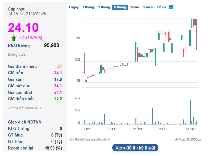 Phiên giao dịch ngày 21/7, cổ phiếu VVS tăng trần lên mức giá 24.100 đồng/cp.