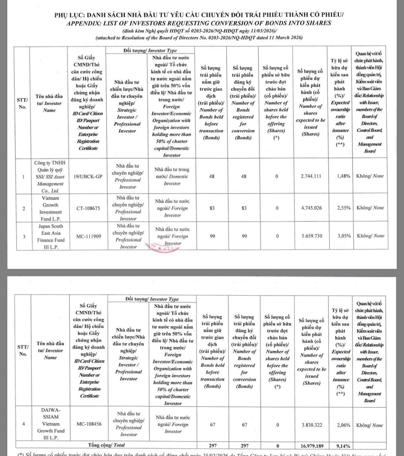 Theo đó, số lượng trái phiếu được chuyển đổi là 297 trái phiếu với mức giá chuyển đổi 17.492 đồng/cổ phiếu.