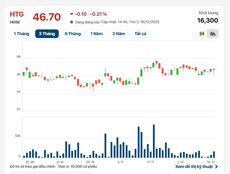 Trên thị trường chứng khoán, cổ phiếu HTG giao dịch quanh vùng giá 46.000 - 47.000 đồng/cp. Kết thúc phiên giao dịch ngày 16/12, thị giá HTG đóng cửa ở mức 46.700 đồng/cp, giảm 0,21% so với tham chiếu.