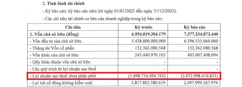 Hệ quả, lợi nhuận sau thuế chưa phân phối tiếp tục “đội” lên mức -2.073 tỷ đồng, phản ánh áp lực tích tụ kéo dài trong hoạt động kinh doanh.