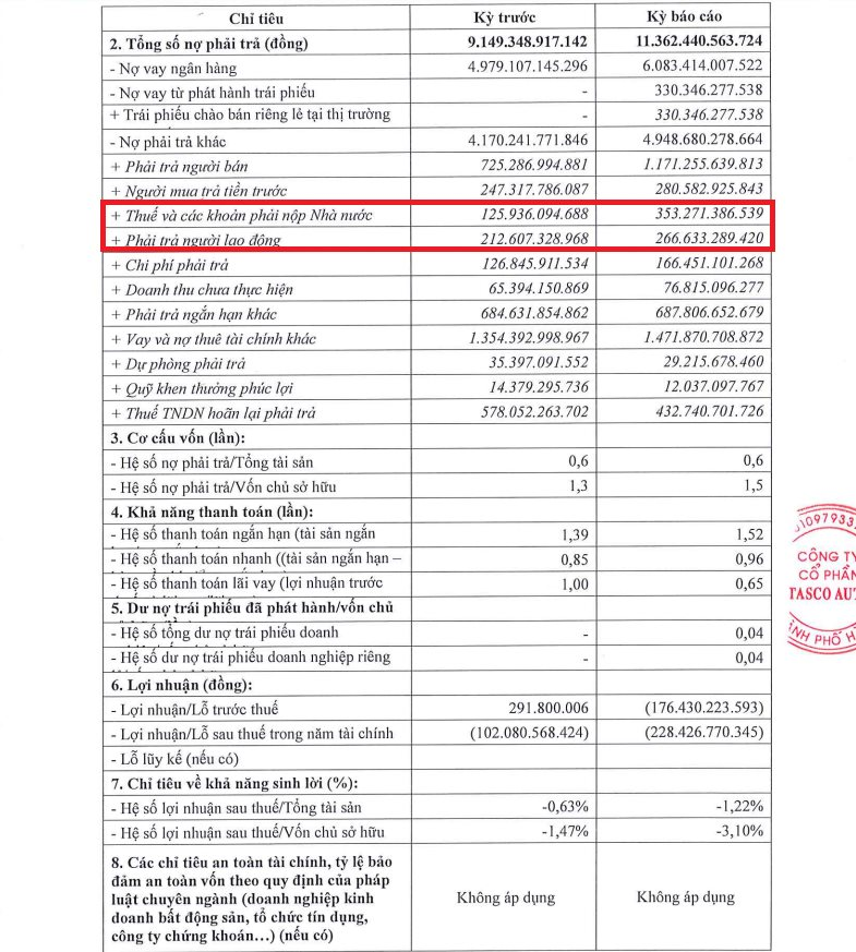 Tính đến cuối năm 2025, tổng nợ phải trả của Tasco Auto là 11.362 tỷ đồng, tăng hơn 2.200 tỷ đồng so với đầu năm. Trong đó, Nợ vay ngân hàng là 6.083,4 tỷ đồng, Nợ vay từ phát hành trái phiếu là 330,3 tỷ đồng và Nợ phải trả khác là 4.948 tỷ đồng.