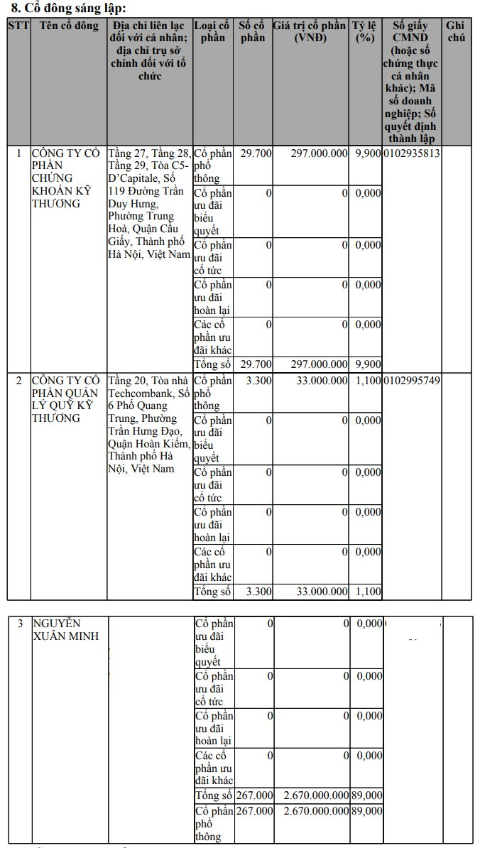 Khi mới thành lập, TCEX có vốn điều lệ 3 tỷ đồng, trong đó, ông Nguyễn Xuân Minh góp 2,67 tỷ đồng, nắm 89% vốn điều lệ, TCBS góp 297 triệu đồng, nắm 9,9% vốn điều lệ và TechcomCapital góp 33 triệu, nắm 1,1% vốn điều lệ.