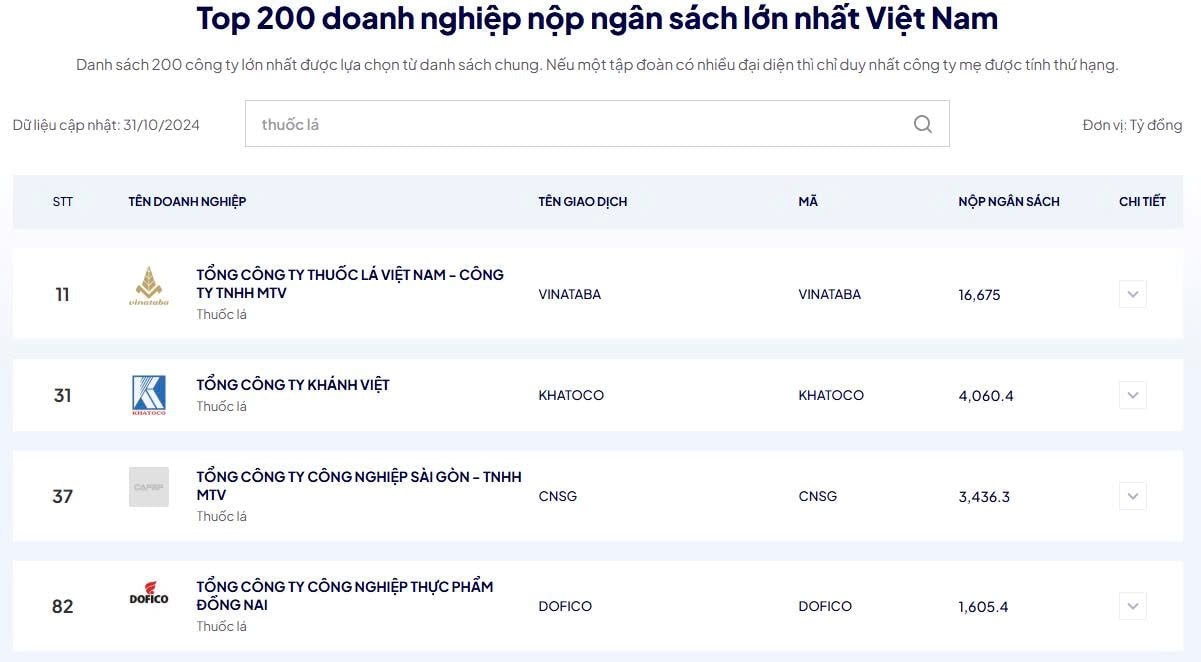 Trong các doanh nghiệp nộp ngân sách lớn nhất cả nước, ngành thuốc lá có 4 công ty, Vinataba dẫn đầu và xếp thứ 11. Tổng Công ty Khánh Việt (Khatoco) nộp ngân sách hơn 4.060 tỷ đồng (xếp thứ 31); Tổng Công ty Công nghiệp Sài Gòn – TNHH MTV (CNSG) nộp ngân sách trên 3.433 tỷ đồng (xếp thứ 37); Tổng Công ty Công nghiệp Thực phẩm Đồng Nai (Dofico) nộp ngân sách hơn 1.604 tỷ đồng và xếp thứ 82.